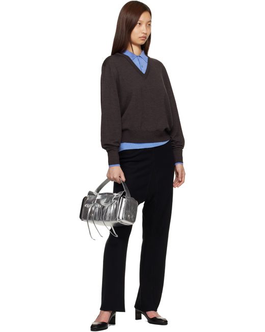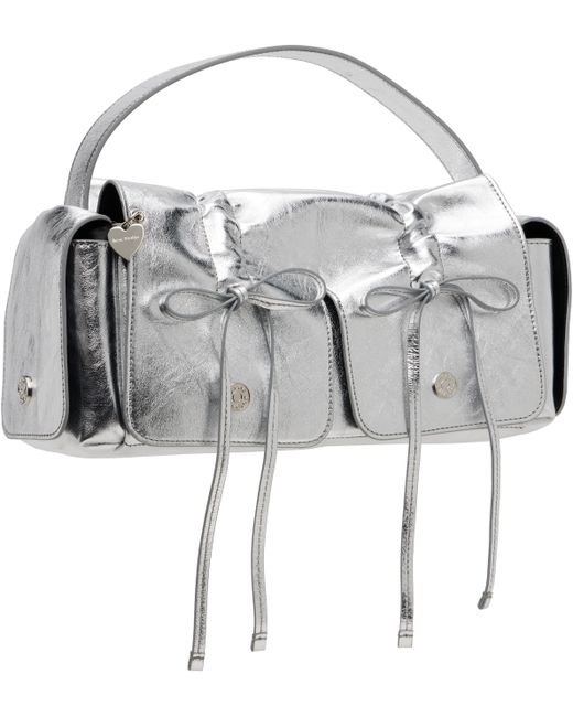Crinkled leather top handle bag. · Logo embossed at adjustable shoulder strap · Detachable crossbody strap · Logo charm and drawstrings at face · Flap pocket at sides · Magnetic flap · Patch pocket at interior · H6 x W14 x D4.5 Supplier color: Silver