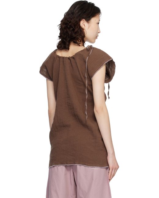 Crinkled woven linen- and cotton-blend blouse. · Certified OEKO-TEX® · Exposed seams throughout · Drawstring at scoop neck · Cap sleeves · Contrast overlock stitching in pink Supplier color: Loam Brown