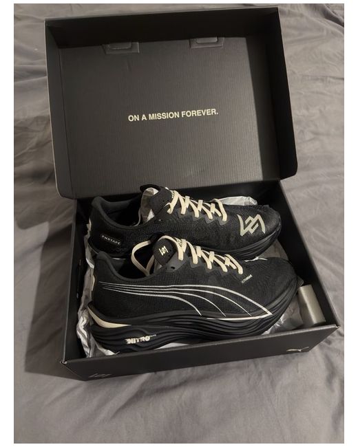Introducing the Represent 247 x PUMA Deviate Nitro Elite 3 in Black Alpine Snow, an elite racing silhouette engineered for speed, efficiency and long-distance performance. This limited-edition collaboration applies the 247 design language to PUMA's flagship race-day model, combining NITROFOAM⢠Elite cushioning with a carbon fibre PWRPlate for explosive propulsion and stability through every stride. The lightweight ULTRAWEAVE upper features contrasting white detailing and dual-branding throughout, completing a technical design built for athletes who demand absolute performance. Sold out online. Message for any more information or photos. Can be bought on here, Vinted or via bank transfer.