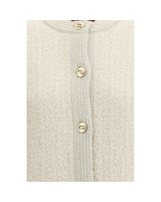 The bouclé lamé wool Cardigan by Gucci conveys refined luminosity through a rich, textured surface that defines the piece’s character. The crew neckline and long sleeves create a classic silhouette, while front pockets and a button fastening ensure balanced elegance. GG Cross buttons add an iconic and recognizable signature. Season: SS26 Fit: Regular Composition: 51% Wool 28% Polyamide 20% Cotton 1% Elastane