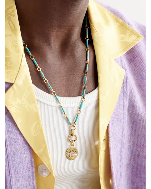 Foundrae’s ‘Element’ necklace is crafted from 18-karat gold and has an 'open' chain beautifully set with veined turquoise. The ‘New Beginnings’ pendant is intricately engraved with a diamond-encrusted rising sun, representing a "sense of limitless freedom".