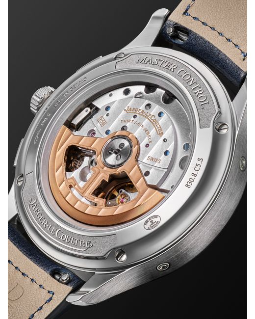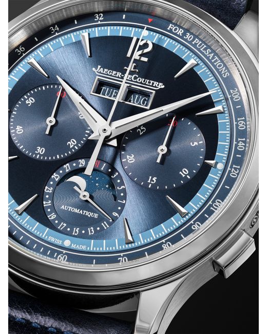 Modern and elegant, Jaeger-LeCoultre's 'Master Control' is defined by its striking two-toned blue dial and complementing leather strap. It features a pulsometer scale around the outer ring and smaller subdials that denote the date, moon phase, seconds and minutes. Turn it over to reveal its exhibition case back, displaying the stunning Swiss-engineered automatic movement. For warranty information, please refer to details & care