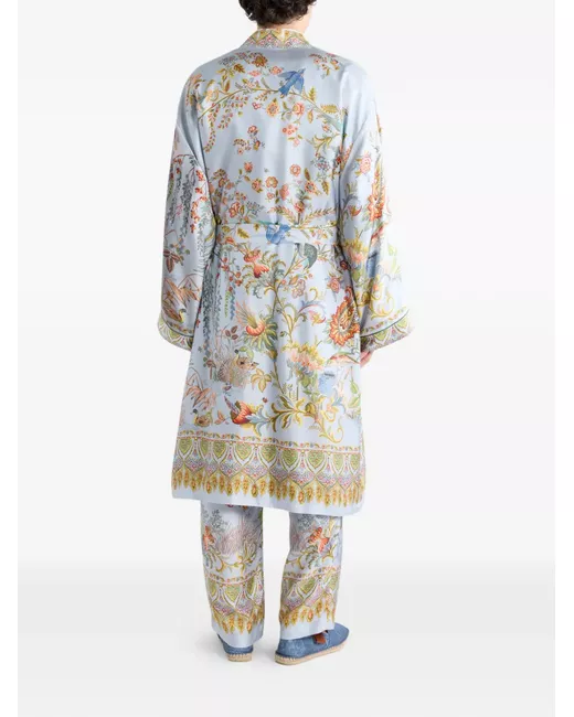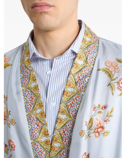 light blue floral print self-tie belt patch pockets shawl lapels long sleeves