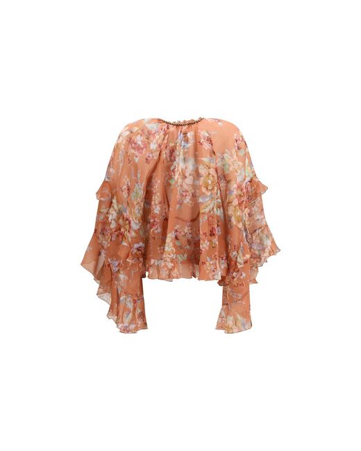 The ruffled Blouse by Zimmerman, crafted from a refined cotton-silk blend, features a cropped, sheer design that adds a touch of sensuality to the look. The collar is embellished with macramé and a cord tie, while the long, asymmetrical sleeves with voluminous ruffles create a dramatic effect. Includes a separate bralette for a perfect fit. A sophisticated and feminine garment, ideal for special occasions. Season: SS26 Fit: Regular Composition: 77% Cotton 23% Silk