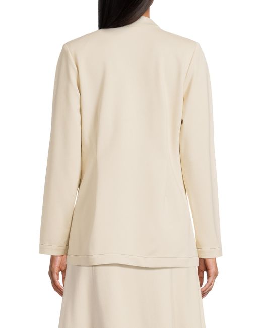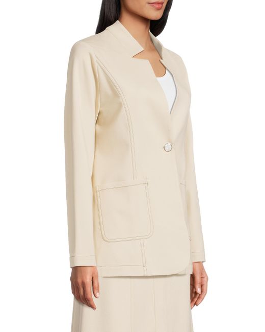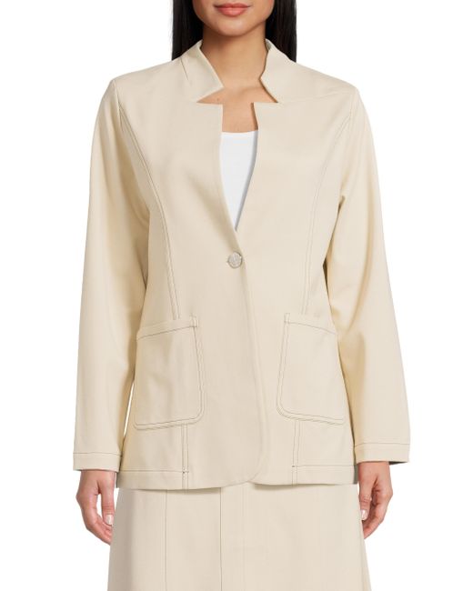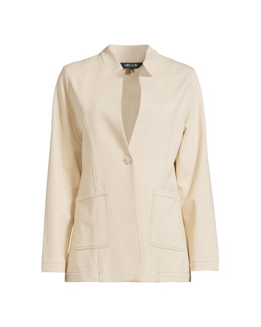Misook's tailored ponte blazer is crafted of a stretch cotton-blend, featuring an inverted notch collar and sculpting princess seams with contrasting stitch detail. Inverted notch collar Long sleeves One-button closure 60% cotton/35% nylon/5% spandex Hand wash Imported SIZE & FIT About 28" from shoulder to hem Model measurements: 5'10" tall Model is wearing a US size 4. Modern Collections - Modern Coll > Misook > Saks Fifth Avenue. Misook. Color: Biscotti Black. Size: Small.
