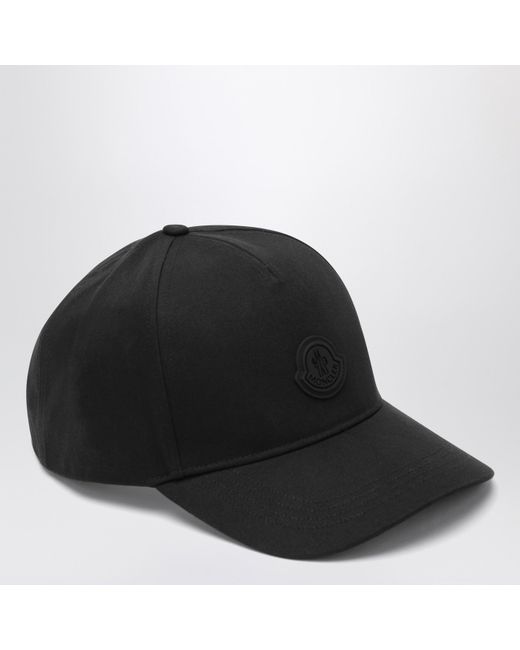 Moncler black cotton baseball cap, featuring a tonal logo patch on the front and adjustable back strap.