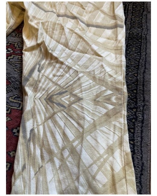 This product is a pair of designer Roberto Cavalli palm leaf pattern jeans, made in Italy. The jeans feature a zip closure, are machine washable, and are crafted from cotton denim in a beige colour. With a flared style, 5-pocket design, and a palm leaf theme, these jeans are perfect for adding a touch of luxury to your summer wardrobe. Made by the renowned brand Cavalli, these regular-sized jeans are a stylish and versatile addition to any woman's clothing collection.