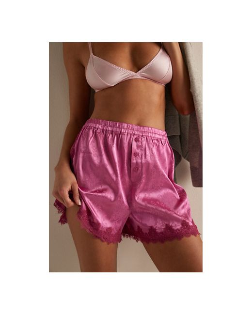 Slip into these sweet, silky tap shorts from Intimately, featured in a pull-on style with a button-fly detail and lace trims. * High-rise * Elastic waistband * Relaxed fit * Satin jacquard fabrication Slip Into Something Shorts by Intimately at Free People in Island Flower, Size: XS