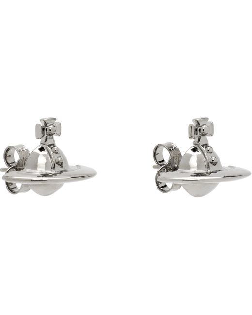 Pair of stud earrings in gunmetal-tone brass. · Logo at face · Post-stud fastening · H0.5 x W0.75 Supplier color: Ruthenium