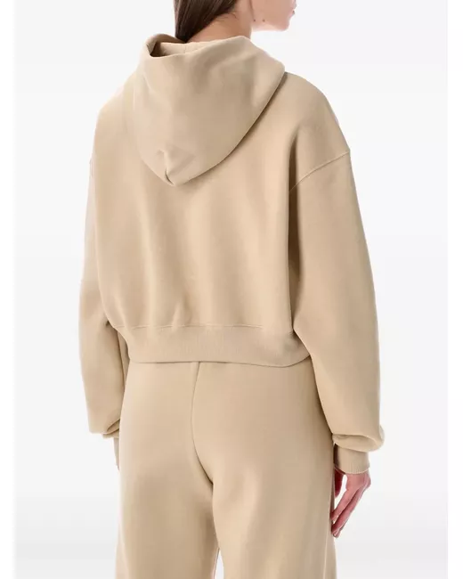 beige logo detail ribbed hem button fastening hooded long sleeves