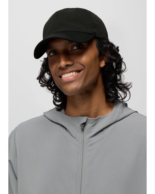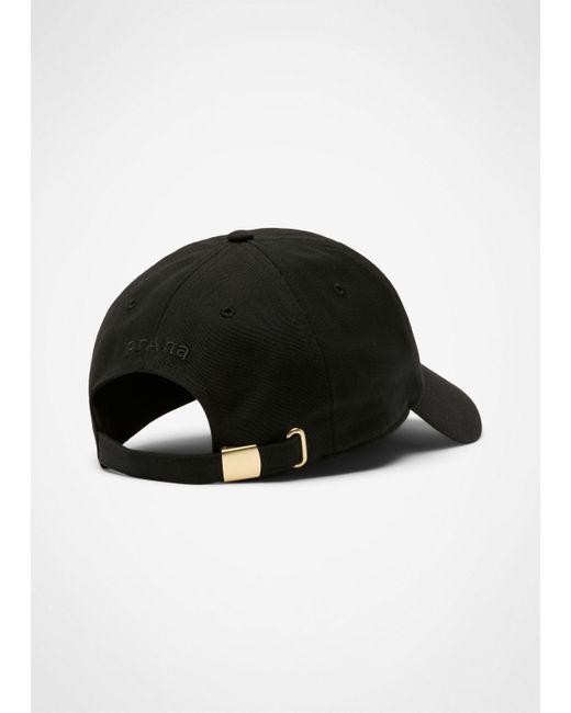 A simply stylish, adjustable hat made with recycled materials and UPF 50 coverage. Embrace simplicity with the Clean Function Hat. Made from recycled materials with a UPF 50 rating, this sleek baseball cap features a curved brim, adjustable back buckle for finding your perfect fit, and a subtle, tonal prAna logo embroidered on the back. | Gender Neutral prAna Clean Function Hat in Black, Size One Size