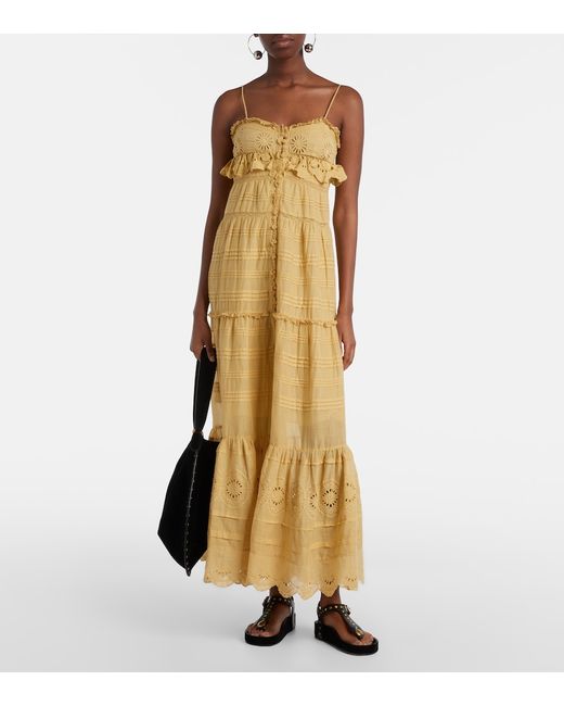 Materiale: 100% cotone. Trattamento: lavaggio in lavatrice a 30°. Made in India. Colore del designer: Light Ochre. Fodera: 100% viscosa. Ricamo: 100% cotone. Chiusura: abbottonatura frontale. Spacco profondo. Spalline regolabili. Cotone.