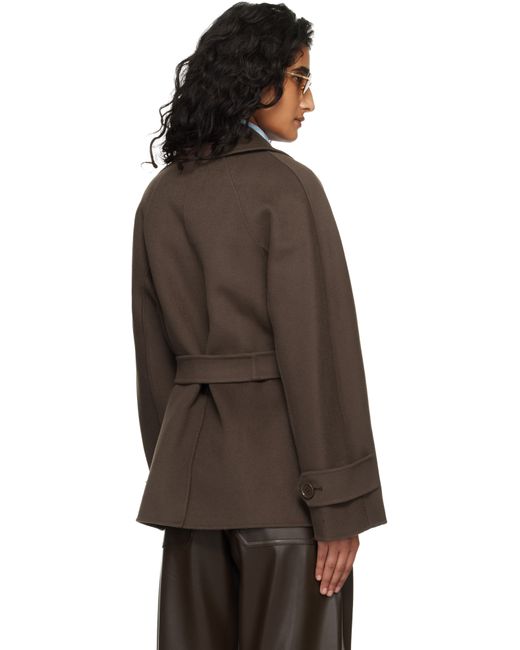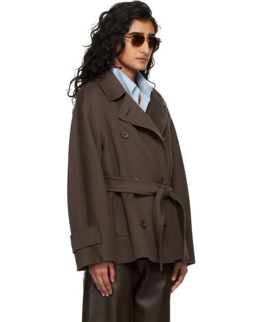 Double-faced virgin wool broadcloth jacket. · Spread collar · Double-breasted button closure · Welt pockets at front · Belt loops and detachable self-tie belt · Raglan sleeves · Button tab at cuffs · Central vent at back hem · Unlined Supplier color: Chocolate