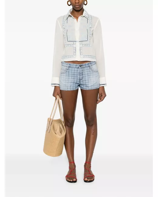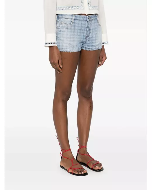 blue plaid pattern frayed hem five pockets belt loops button closure