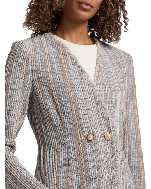 This Misook knit jacket features a V-neck, shoulder pads, and a fringe trim. V-neck Padded shoulders Long sleeves Button-front closure 31% nylon/30% acrylic/28% viscose/11% rayon Hand wash Imported SIZE & FIT About 24" from shoulder to hem Model measurements: 5'10" tall Model is wearing a US size Small. Modern Collections - Modern Coll > Misook > Saks Fifth Avenue. Misook. Color: Biscotti Blue White Black. Size: Small.