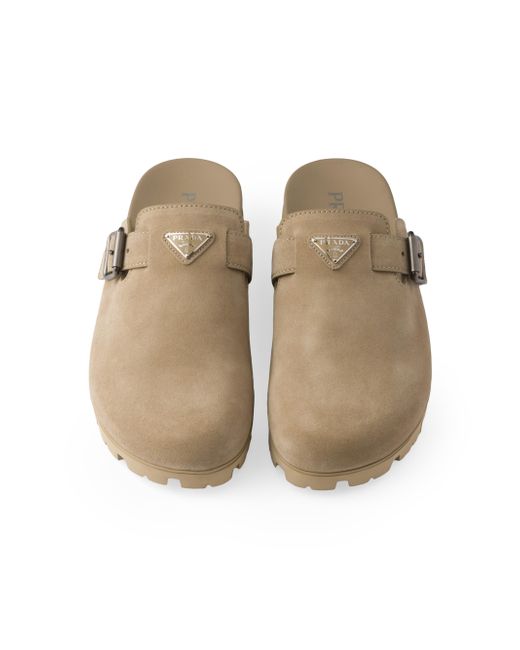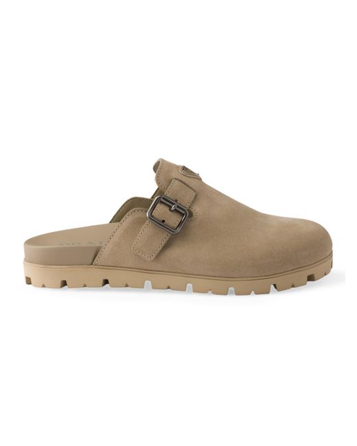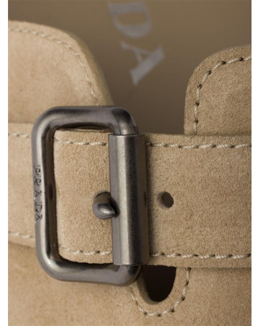Leather lining Upper with strap, metal buckle and enameled metal triangle logo Rubber sole Leather insole Imported 100% Calf Leather. Lsd Rtw - Prada Rtw > Prada > Saks Fifth Avenue. Prada. Color: Beige Khaki. Size: 7.