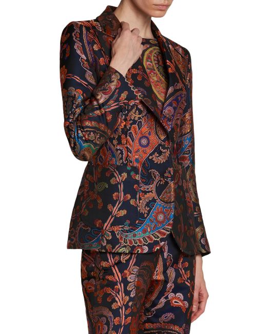 Crafted of ornate paisley brocade, this Etro jacket is tailored for a fitted silhouette with a peak lapel and fabric-covered buttons. Peak lapels Padded shoulders Long sleeves Chest and side patch pockets Two-button closure 100% polyester Dry clean Made in Italy SIZE & FIT Model measurements: 5'10" tall Model is wearing a US size 4 ABOUT THE BRAND The Italian fashion house renowned for its eclectic prints and signature paisley motif has been a family-run business since its inception in 1968. Creative Director Marco de Vincenzo continues the brand's legacy with the rich textiles and patterns still used in its clothing, accessories and home dƩcor. Designer Lifestyle - Etro > Etro > Saks Fifth Avenue. Etro. Color: Multicolor Blue Base. Size: 2.