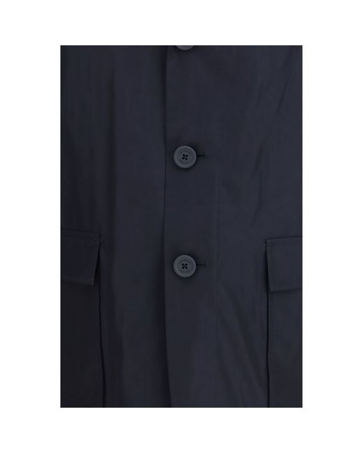 The packable logo print Jacket by Thom Browne expresses modern functionality through a clean and refined design. Crafted from lightweight memory fabric, it is designed to be easily folded while maintaining a structured and polished silhouette. The jacket features a classic collar and a front button closure that reinforce its understated elegance, complemented by flap side pockets. A subtle logo print on the back adds a distinctive signature, while the signature grosgrain loop at the rear completes the look. Designed with a straight fit, this jacket delivers effortless sophistication with everyday practicality. Season: SS26 Fit: Regular Composition: 100% Polyester