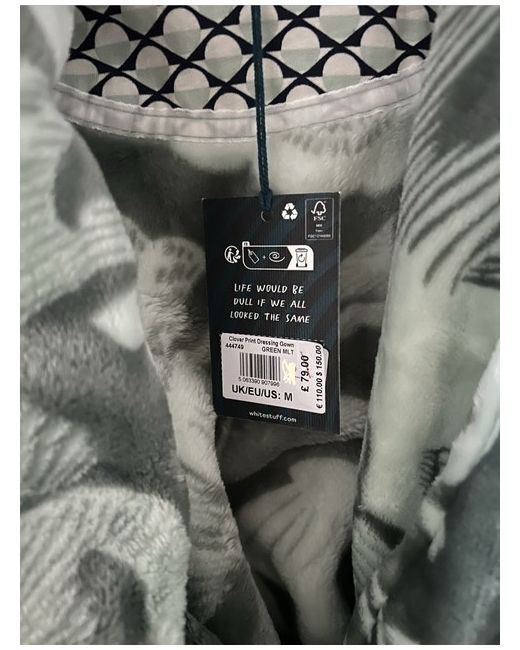 CLOVER PRINT DRESSING GOW The White Stuff Dressing Gown is a cosy and elegant addition to any woman's wardrobe. This relaxing fit robe features a shawl neck design and long sleeves, perfect for lounging in style. Made from polyester, this green-coloured dressing gown is machine washable for easy care and maintenance. With a classic outdoor theme, this dressing gown is ideal for the spring and summer seasons, providing both comfort and style for a relaxing night's sleep.