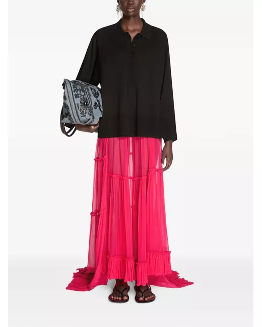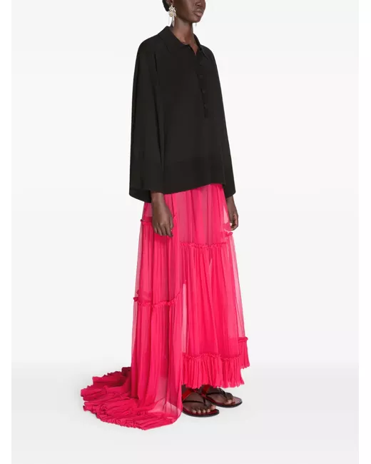 black wide sleeves button closure polo collar ribbed hem straight hem