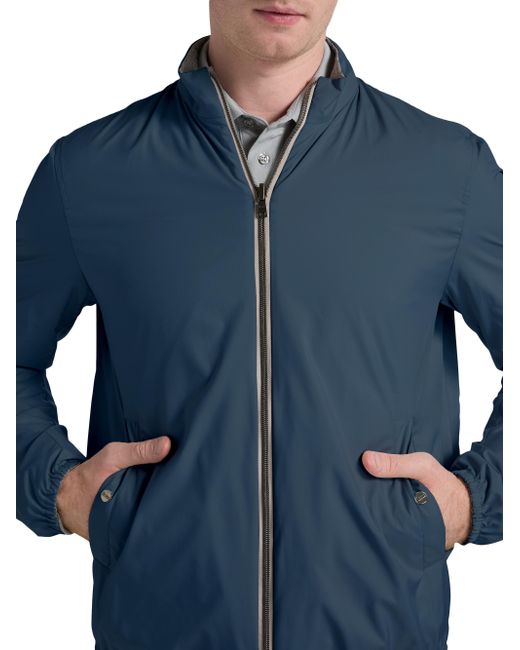 This bomber jacket from Henro reverses from a classic windbreaker-like ripstop to a heathered jersey. A stand collar, snap and zip side pockets, and elasticized trim complete this full-zip style. Stand collar Long sleeves Side snap-slant pockets Interior zip pockets Elasticized trim Front zip closure 100% polyester Dry clean Made in Italy SIZE & FIT Model measurements: 6'2" tall, 40" chest, 31" waist Model is wearing a US size Medium. Mens Modern Coll & Outer - Contemporary Outerwear > Herno > Saks Fifth Avenue. Herno. Color: Sky Blue. Size: 48.