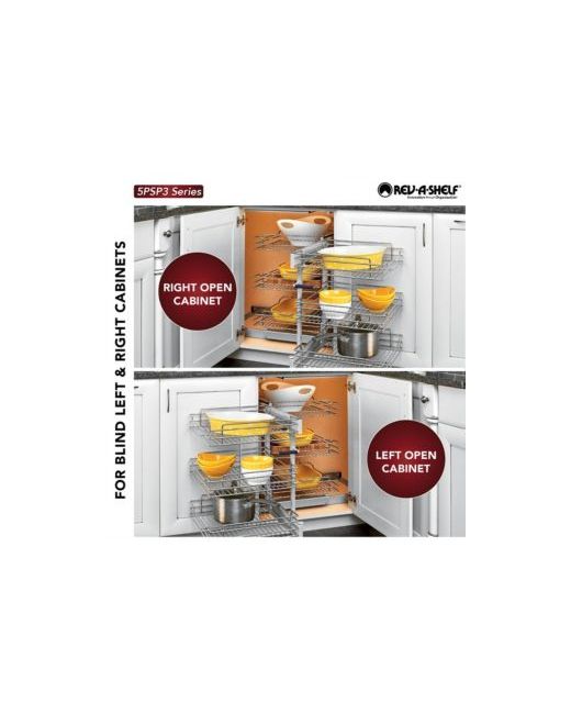 Get the most out of your cabinet space with the Rev-a-Shelf 5PSP Pullout Blind Corner Kitchen Cabinet Organizer. This kitchen cabinet organizer conveniently keeps your blind cabinet organized and functional with additional mounted storage space. The Rev-a-Shelf 5PSP Series maximizes space in blind corner cabinets while allowing the user full accessibility to the entire unit. The unit is specifically designed to fit into left or right cabinets to create full accessibility. The organizer is crafted from heavy-gauge plated metal wire for durability and reliability and is backed by a limited lifetime warranty for extra peace of mind. This pullout organizer features a 3-piece zinc-plated full-extension ball-bearing slide system that allows the unit to slide completely outside of the cabinet, providing easy access to hard-to-reach items stored in the back