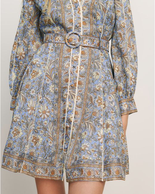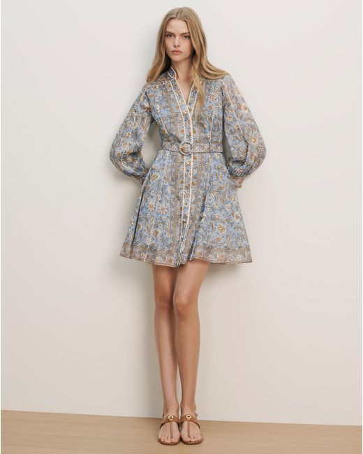 In a luxe silk-linen blend, the Kumar is an airy, lightweight mini dress featuring an intricate sky-blue floral pattern and delicate ladder-lace trim. A split V-neckline leads into a button-down front, while blouson sleeves add soft volume and a removable matching belt cinches the waist. Perfect for warm-weather escapes or date nights-just add a strappy sandal or heel.70% Linen, 30% SilkLining: 100% CottonDry clean onlyStyle #2603FL5522386