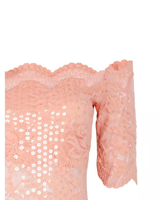 salmon pink off-shoulder elbow-length sleeves lace scalloped trim sequin embellishment