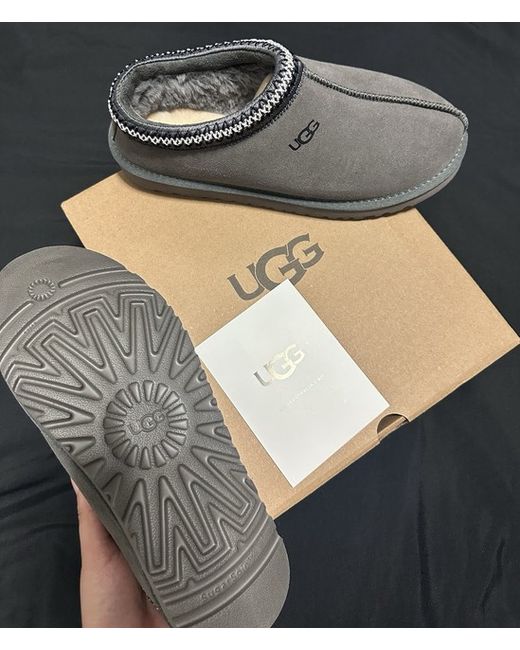 The UGG Tasman Women's slipper is a casual and comfortable choice for the winter season. Featuring a round toe shape and slip-on closure, it offers a low heel height and is made with suede upper material and sheepskin lining for added warmth and comfort. With a rubber outsole and wool insole, this slipper from UGG Australia is perfect for lounging around the house in style. The grey colour and logo accents add a touch of sophistication to this classic UGG model, making it a must-have for any woman's shoe collection.