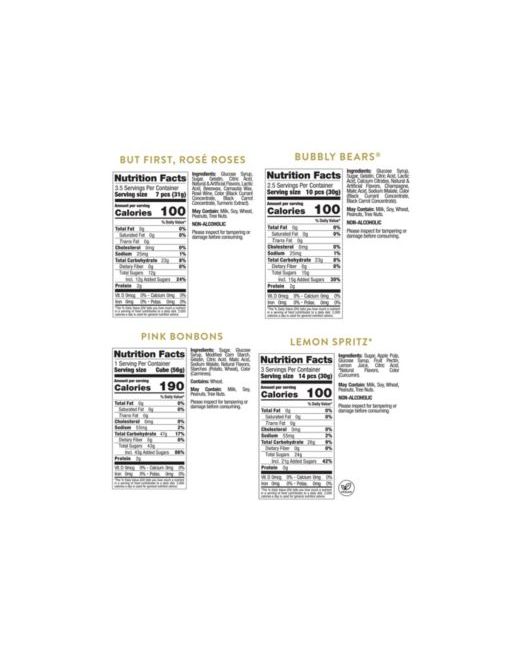 La Vie en Rose Sugarfina exclusive contains: Pink Bonbons: fluffy strawberry-flavored candies, Bubbly Bears: classic Champagne Bears dusted with tart sugar crystals, But First, Rose Roses: made with Rose wine from Provence, Lemon Spritz: infused with lemon and rolled in Italian sugar crystals.