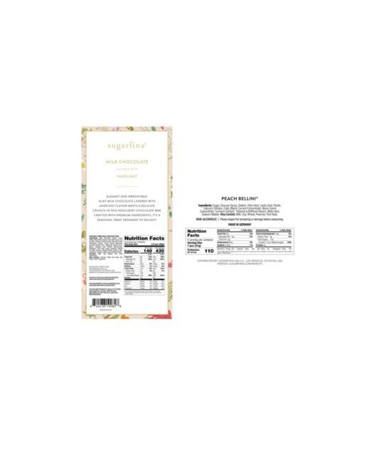 Elegant and irresistible this bundle includes: Hazelnut Crepe Milk Chocolate Bar: silky milk chocolate layered with hazelnut flavor, Peach Bellini Celebration Bottle: gummies filled with a juicy peach-flavored center and dusted in sweet-and-sour sugar crystals.