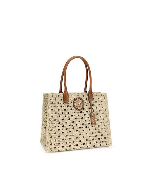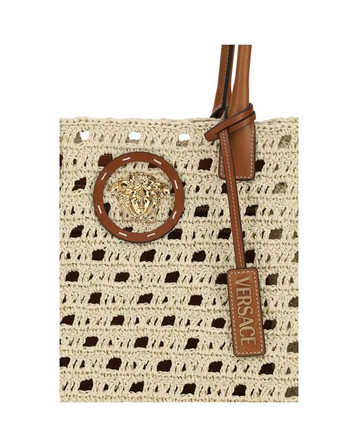 The Tote Bag by Versace features a top handle, gold-tone hardware, and a logo plaque that enhance its iconic aesthetic. The internal zip pocket ensures practicality and organization. Crafted from high-quality materials, it combines elegance and functionality, perfect for completing everyday outfits or more sophisticated looks. The refined design and distinctive details make it a versatile and contemporary accessory, a key feature of the modern wardrobe. Season: SS26 Composition: 100% Cotton