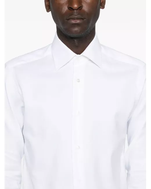 white cotton piqué weave front button fastening spread collar long sleeves with buttoned cuffs curved hem