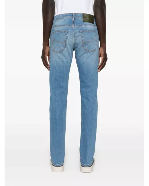 blu misto cotone denim con effetto schiarito chiusura con bottoni passanti vita media design classico a cinque tasche logo laterale dettagli con strappi effetto vissuto nelle cosce applicazione posteriore con logo dettaglio con fazzoletto da taschino taglio slim