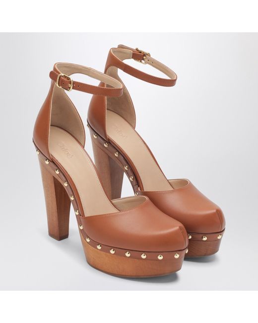 Pumps by Chloé in brown leather• round toe• high heel and platform• small gold stud details• adjustable ankle strap closure• leather sole