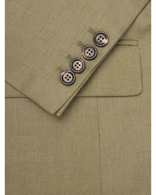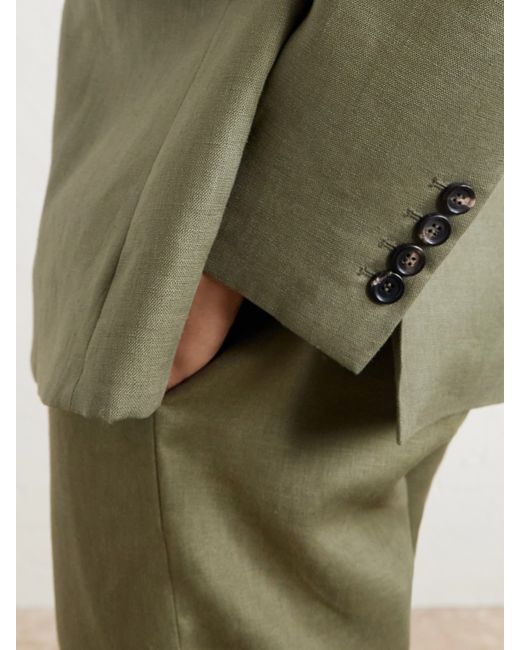 Tailored from breathable linen, this double-breasted blazer by BODE balances classic structure with an easy drape. The peaked lapels and buttoned front lend definition, while the lightweight cloth softens the silhouette, giving formal lines a more relaxed, lived-in character.