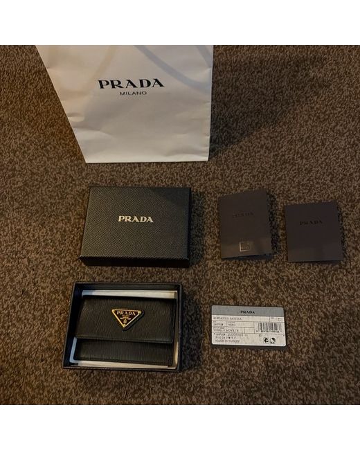 The Prada Wallet/card holder is a stylish and sophisticated accessory designed for women, made from high-quality black leather. Featuring a logo accent and credit card slots, this card holder wallet exudes luxury and elegance. The sleek design and iconic branding make it a versatile choice for everyday use or special occasions, perfect for keeping your essentials organized in style. Made by PRADA, this wallet is a symbol of fashion and quality craftsmanship.