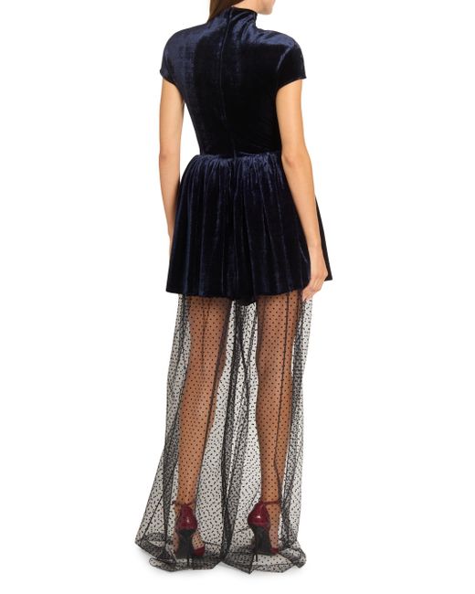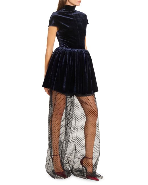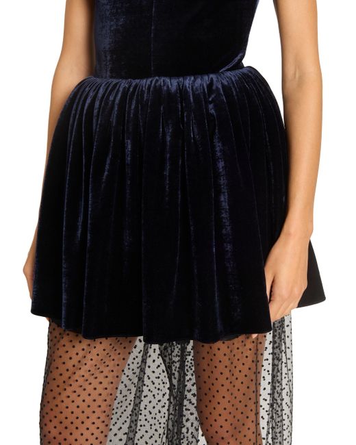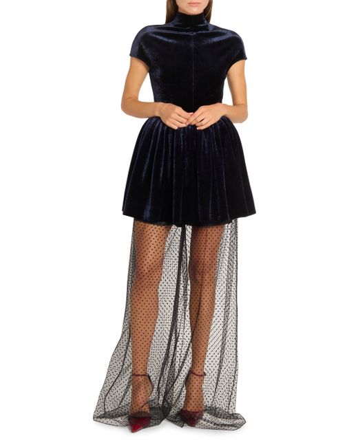 This statement piece from Alaïa is designed with a structured velvet minidress overlay paired with a sheer polka dot tulle skirt, creating a dramatic layered effect. Stand collar Short sleeves Concealed back zip closure 50% polyamide/38% viscose/12% elastane Lining: 100% cotton Dry clean Made in Italy SIZE & FIT Model measurements: 5'10" tall Model is wearing a US size 4 ABOUT THE BRAND A trained sculptor, Tunisian designer Azzedine Alaïa presented his first collection in 1981 after years of creating for others. Revered for his impeccable craftsmanship and signature fit-and-flare dresses, Alaïa's goal was to make women feel their best. With Pieter Mulier now at the helm, the label's precision is exemplified by timeless ready-to-wear and laser-cut accessories. Advanced Designer - Adv Couture-alaia > Alaïa > Saks Fifth Avenue. Alaïa. Color: Minuit. Size: 4.