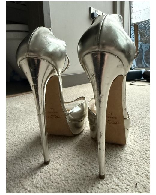 The Jimmy Choo Max 150 Silver Heels are a stylish and glamorous addition to any woman's wardrobe. These platform heels are perfect for parties or cocktail events, with a UK shoe size of 7 and EU size of 34.5. Made from leather with a standard shoe width, these heel sandals are customised to be a statement piece for the summer season. The silver colour and iconic Jimmy Choo branding add a touch of luxury and elegance, making them a must-have for any fashion-forward woman.