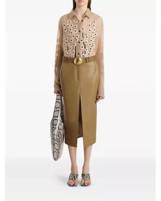 A menswear-inspired button-up transformed by dimensional embroidery: flowers of satin ribbon and intricate cording, each element applied by hand on sheer silk organza selected for its lightweight structure and crisp character. Designed for a relaxed fit with back yoke, shirttail hem, and single-button cuffs. beige long sleeves polo collar embroidered flowers