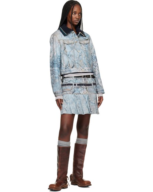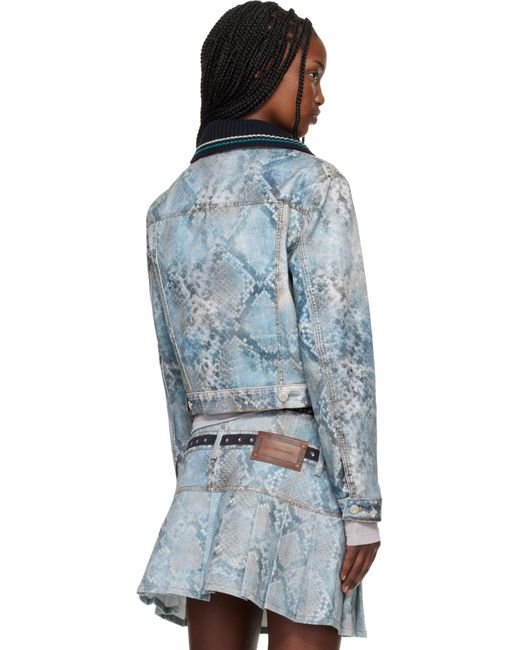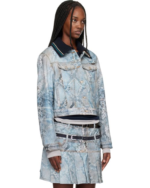 Non-stretch denim jacket. · Trompe d'oeil snake pattern printed throughout · Detachable rib-knit overlay at corduroy spread collar · Button closure · Flap pockets at chest · Logo flag at pocket · Welt pockets at waist · Buttoned barrel cuffs · Adjustable button tabs at back hem · Twill lining · Logo-engraved silver-tone hardware · Contrast stitching in tan Supplier color: Blue