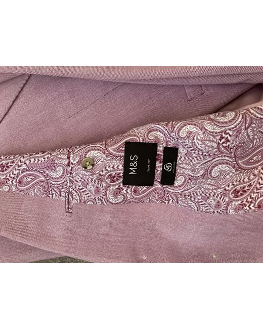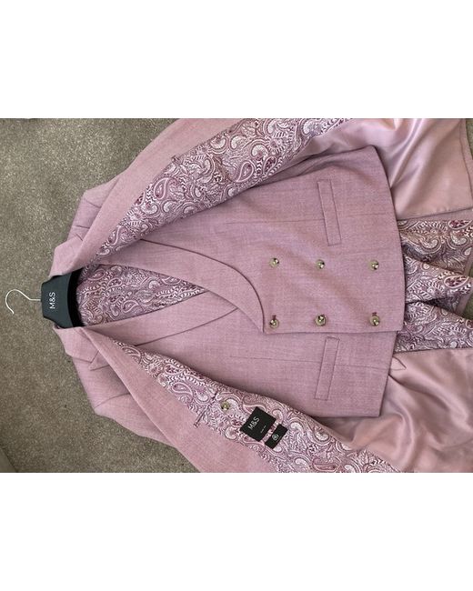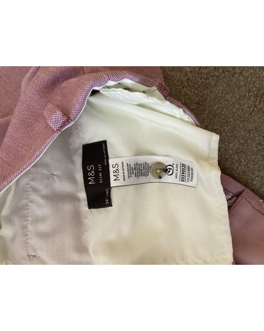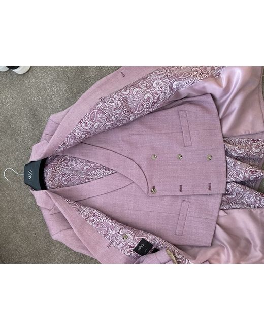 This 3 piece suit by Marks & Spencer is perfect for a wedding occasion, with a stylish pink /salmon fabric and a notch lapel style jacket featuring button sleeve detail. The suit includes a waistcoat, trousers with a straight leg style, and a regular fit jacket with a two-button front.l,this suit is ideal for summer weddings and can be dry cleaned for easy maintenance. Perfect for the groom or any wedding guest looking for a sophisticated and dapper outfit.