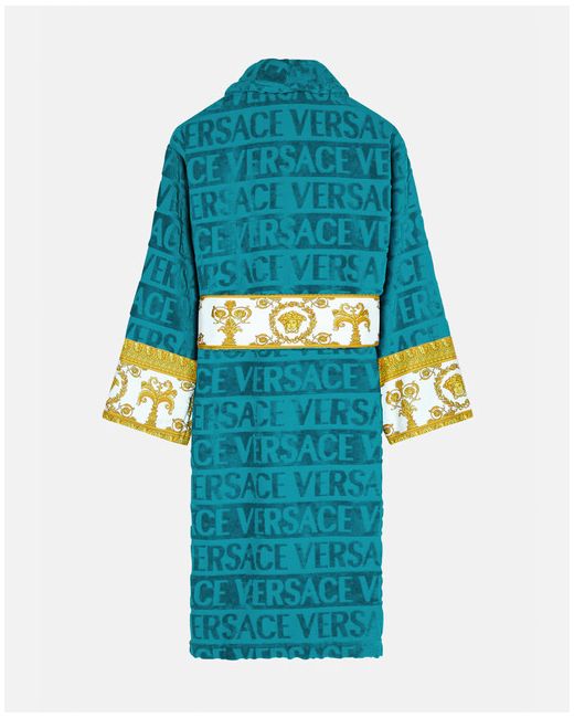 This terry-towelling bathrobe features a tonal Versace Allover motif with contrast I ♡ Baroque printed sleeves and wrap belt. RRP £390 (ATTACHED SCREENSHOT OF SIMILAR ROBE). Versace Allover motif. I ♡ Baroque print.
