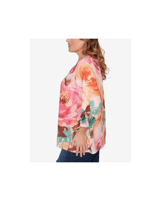 Bold and expressive, this floral knit top is designed with a scalloped neckline and open trim detailing. Elastic at the sleeves creates soft shape while maintaining comfort. The vibrant sublimation print adds rich color and depth. A statement top that brings energy to simple bottoms.