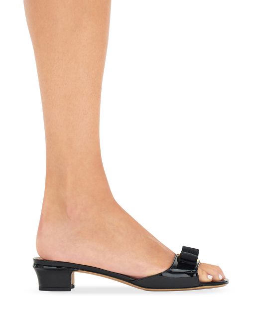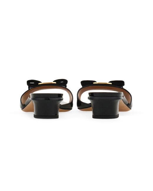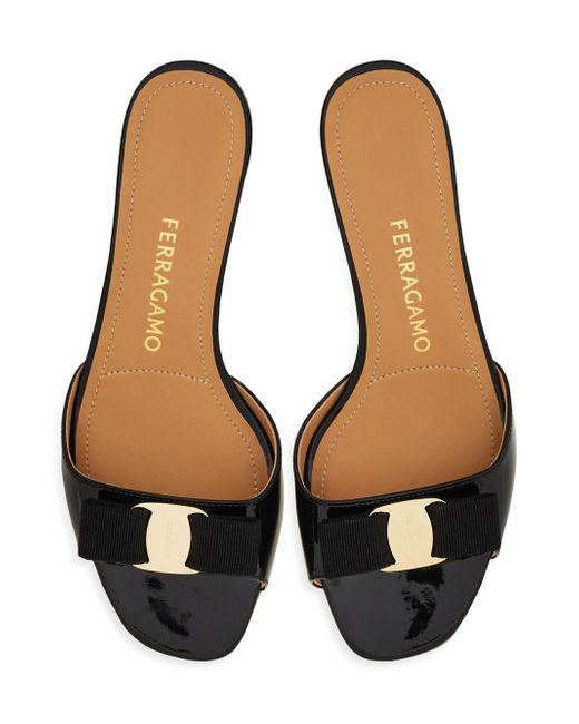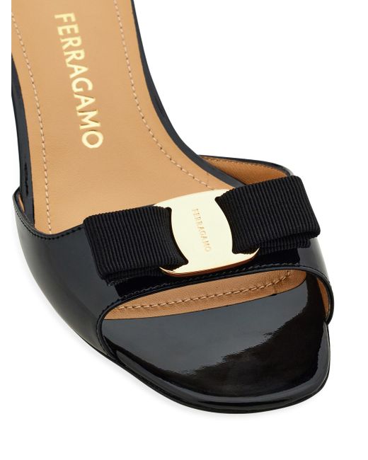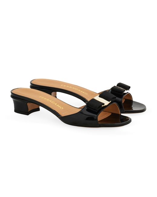 These mules from FERRAGAMO are crafted of patent leather and feature a signature bow detail and logo-engraved hardware. Open toe Slips on Patent leather upper Made in Italy SIZE Block heel: about 1" (25mm) ABOUT THE BRAND Italian designer Salvatore Ferragamo began his journey in 1927 in Italy with a vision of creating the world's most beautiful shoes. Since its inception, Ferragamo has expanded to include clothing, accessories and beauty under the creative direction of Maximilian Davis-who brings a minimalist-meets-maximalist aesthetic to the brand. Women's Shoes - Ferragamo W Shoes > Ferragamo > Saks Fifth Avenue. FERRAGAMO. Color: Nero Biscotto. Size: 6.5.