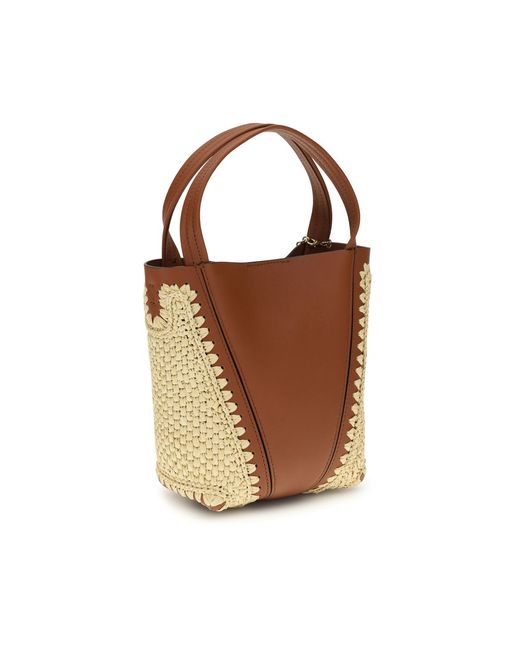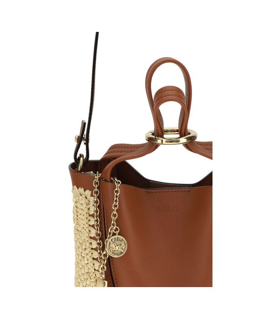 The Spin raffia Bucket Bag by Chloé features a large main compartment, removable and adjustable shoulder strap, and magnetic closure. Made from lightweight raffia, it combines practicality and elegance, offering a versatile accessory perfect for completing summer and casual looks with sophisticated style. Season: SS26 Dimension: 18x19x8 Composition: 70% Raffia 30% Calf Leather Bos Taurus