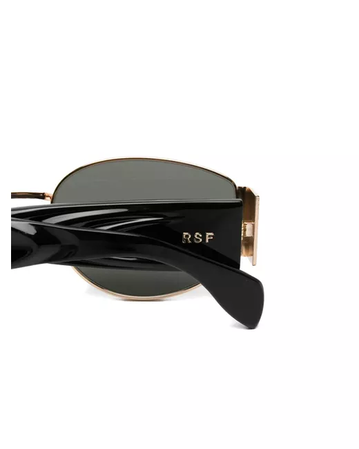 gold-tone/black tinted lenses nose pads logo lettering oval frame These glasses come with a protective case.