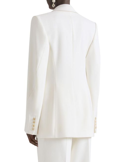 Double-breasted Cocoon Blazer in wool and mohair. Sarah Burton reexamines the craft of tailoring in the Givenchy atelier cutting womenâ s patterns with a sartorial menswear hand to emphasize the feminine silhouette. Blazer in wool and mohair Peaked lapel Double breasted Buttoned cuffs One chest pocket Two front flap pockets Couture seams for a cocooning volume Relaxed fit Composition: 65% wool, 35% mohair Lining: 100% polyester Made in Italy. Lsd Rtw - Givenchy Rtw > Givenchy > Saks Fifth Avenue. Givenchy. Color: White. Size: 4.