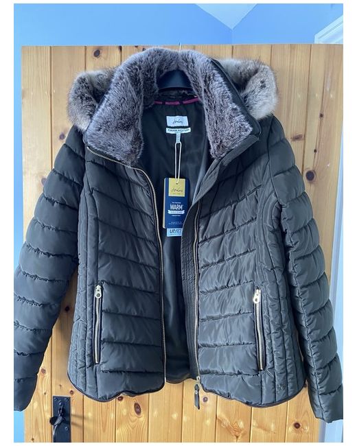 Women's Joules Padded Jacket in size 16 . Dark khaki green colour with detachable faux fur collar and trimmed hood. Made from polyester with a quilted design, this short-length jacket features a regular fit. With its machine washable lining and padded insulation, this jacket is perfect for casual occasions, providing both comfort, warmth and style. The Joules brand ensures quality and attention to detail, making it a must-have addition to any woman's wardrobe. Brand new with tags. I paid £169 but willing to sell at less than half that price at £80. What a bargain!
