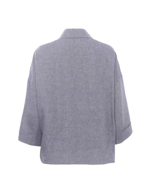 blue button fastening point collar chest pockets rolled-up cuffs short sleeves